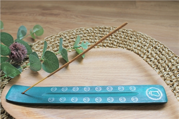Porte-encens pour bâton en bois de manguier chakra du coeur CHAKRA & LUCK [DESCRIPTION] Porte-encens en bois de couleur verte adapté aux bâtons d'encens. Ce porte-encens représente le chakra du cœur (Anahata) qui correspond à l'éveil spirituel, l'équilibre et la stimulation. [CARACTÉRISTIQUES] Porte-encens en bois de manguier verte. Dimensions : 26 x 3,5 cm. Fabriqué en Inde. [CONSEILS D'UTILISATION] Allumer l'extrémité de l'encens jusqu'à ce qu'elle s'enflamme. Lorsqu'elle est incandescente, souffler dessus délicatement pour éteindre la flamme. Placer le bâton d'encens sur son porte-encens. [PACKAGING] Fourreau carton imprimé brochable