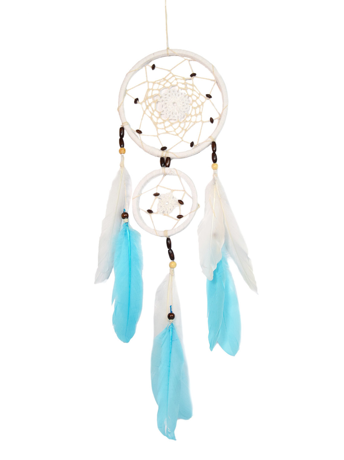 Attrape-rêves Plumes Bleu et Blanc 15 cm [DESCRIPTION] Objet riche en symbolisme, l'attrape-rêves est un talisman amérindien qui permet, selon la tradition, de se protéger la nuit des mauvais esprits et des mauvais rêves. Cet attrape-rêve traditionnel au design élégant s'intègrera à la perfection dans un intérieur bohème tout en y apportant une touche de spiritualité. [CARACTÉRISTIQUES] Attrape-rêves en bois, coton et plumes naturelles. Diamètres 15 cm et 9.5 cm. [PACKAGING] Attrape-rêve dans un sac plastique de protection et de transport. A sortir de l'emballage pour exposer en magasin. [PRÉCAUTIONS D'EMPLOI] Utilisation intérieure uniquement.