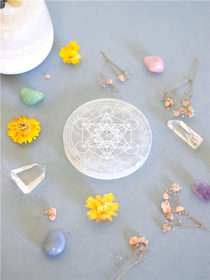 Socle en sélénite gravé Cube de Métatron diamètre 10 cm [DESCRIPTION] Élevez votre espace avec ce socle en sélénite gravé du puissant Cube de Métatron, l'un des symboles les plus puissants de la géométrie sacrée. En incorporant toutes les formes existantes dans l'univers, le Cube de Métatron représente la somme de tout ce qui est, a été et sera. Son taux vibratoire élevé agit directement sur les personnes et les lieux, offrant une protection maximale contre les énergies négatives et favorisant l'harmonisation des énergies. La sélénite, connue pour ses propriétés purifiantes et apaisantes, amplifie ces effets. Idéal pour trouver le calme intérieur, se connecter avec l'univers et le soi supérieur, et purifier ou recharger vos bijoux et pierres naturelles, ce socle allie beauté et puissance spirituelle pour enrichir vos moments de méditation et de bien-être. [CARACTÉRISTIQUES] Socle en sélénite gravé. Diamètre 10 cm. [CONSEILS D'UTILISATION] Placez vos cristaux, bijoux ou autres objets énergétiques sur le socle en sélénite pour les recharger et les purifier. [PACKAGING] Socle protégé dans du papier bulle. PCB de 2, socles regroupés dans un carton. [PRÉCAUTIONS D'EMPLOI] La sélénite est une pierre fragile, tendre et soluble dans l'eau. Évitez de la plonger dans l'eau ou de l'exposer à une humidité excessive pour prévenir toute dégradation. Manipulez le socle avec précaution pour éviter les chocs ou les rayures.