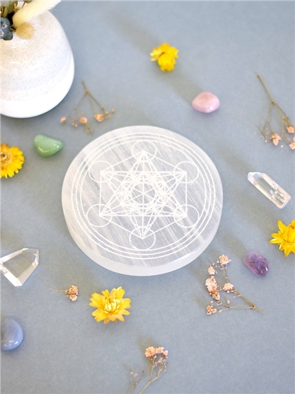Socle en sélénite gravé Cube de Métatron diamètre 14 cm [DESCRIPTION] Élevez votre espace avec ce socle en sélénite gravé du puissant Cube de Métatron, l'un des symboles les plus puissants de la géométrie sacrée. En incorporant toutes les formes existantes dans l'univers, le Cube de Métatron représente la somme de tout ce qui est, a été et sera. Son taux vibratoire élevé agit directement sur les personnes et les lieux, offrant une protection maximale contre les énergies négatives et favorisant l'harmonisation des énergies. La sélénite, connue pour ses propriétés purifiantes et apaisantes, amplifie ces effets. Idéal pour trouver le calme intérieur, se connecter avec l'univers et le soi supérieur, et purifier ou recharger vos bijoux et pierres naturelles, ce socle allie beauté et puissance spirituelle pour enrichir vos moments de méditation et de bien-être. [CARACTÉRISTIQUES] Socle en sélénite gravé. Diamètre 14 cm. [CONSEILS D'UTILISATION] Placez vos cristaux, bijoux ou autres objets énergétiques sur le socle en sélénite pour les recharger et les purifier. [PACKAGING] Socle protégé dans du papier bulle. PCB de 2, socles regroupés dans un carton. [PRÉCAUTIONS D'EMPLOI] La sélénite est une pierre fragile, tendre et soluble dans l'eau. Évitez de la plonger dans l'eau ou de l'exposer à une humidité excessive pour prévenir toute dégradation. Manipulez le socle avec précaution pour éviter les chocs ou les rayures.