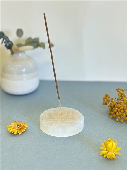 Porte-encens rond en sélénite gravé Fleur de vie. [DESCRIPTION] Élevez l'énergie de votre espace avec ce porte-encens en sélénite, orné du motif Fleur de Vie. Ce symbole universel de création et d'harmonie est gravé avec précision sur la surface en sélénite, une pierre réputée pour ses propriétés purifiantes et apaisantes. En plus de servir de support élégant pour vos bâtons d'encens, ce porte-encens aide à neutraliser les énergies négatives et favorise un environnement équilibré et serein. Idéal pour vos moments de méditation ou de relaxation, il allie beauté esthétique et bienfaits énergétiques pour enrichir votre espace sacré. [CARACTÉRISTIQUES] Porte-encens rond en sélénite gravé Fleur de vie. Diamètre environ 10 cm. [PACKAGING] Porte-encens protégé dans du papier bulle. PCB de 2, portes-encens regroupés dans un carton. [PRÉCAUTIONS D'EMPLOI] La sélénite est une pierre fragile, tendre et soluble dans l'eau. Évitez de la plonger dans l'eau ou de l'exposer à une humidité excessive pour prévenir toute dégradation. Manipulez le socle avec précaution pour éviter les chocs ou les rayures.