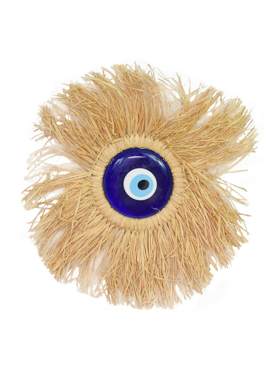 Suspension murale ronde Raphia Œil de Nazar 25 cm [DESCRIPTION] Apportez une touche culturelle et spirituelle à votre intérieur grâce à cette suspension Œil de Nazar. L'Œil de Nazar, aussi appelé "Nazar Boncuk" en turc, est un talisman en verre représentant un œil stylisé composé de cercles concentriques bleu foncé, blanc, bleu clair et noir. Originaire de la Méditerranée orientale et particulièrement répandu en Turquie, Grèce et au Moyen-Orient, il est utilisé depuis des millénaires pour se protéger contre le mauvais œil. Ce talisman absorbe l'énergie négative dirigée vers son porteur, et s'il se casse, cela signifie qu'il a rempli sa mission. Traditionnellement fabriqué par des artisans soufflant le verre, l'Œil de Nazar est souvent accroché aux portes, porté en bijoux, ou suspendu dans son intérieur pour bénéficier de sa protection au quotidien. Cette décoration murale en raphia et Œil de Nazar peut servir à la fois d'élément décoratif et de symbole protecteur, apportant une touche esthétique et spirituelle à tout intérieur. [CARACTÉRISTIQUES] Suspension décorative en raphia, bois et œil de Nazar en verre. Système de suspension non fourni. [CONSEILS D'UTILISATION] Placez cette suspension murale dans votre intérieur pour bénéficier de ses énergies protectrices au quotidien. [PACKAGING] Suspension protégée dans un sachet plastique. [PRÉCAUTIONS D'EMPLOI] Le raphia et le verre peuvent être dépoussiérés régulièrement avec un chiffon doux pour maintenir leur apparence.