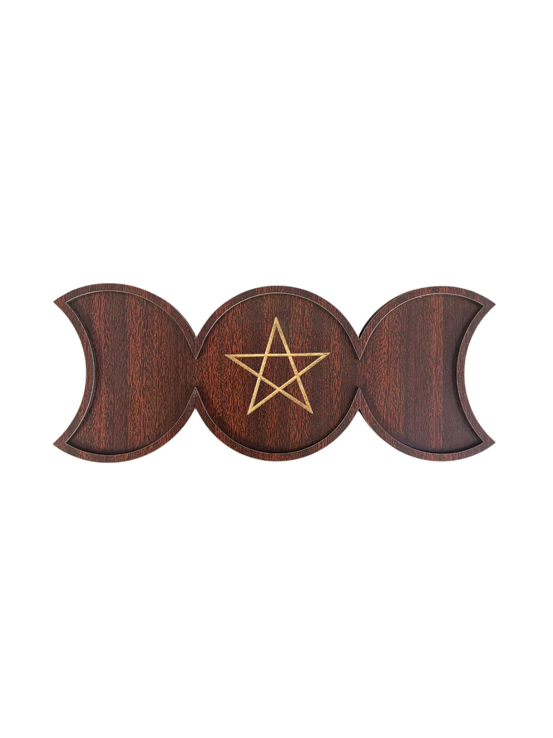 Support en bois Triple Lune [DESCRIPTION] Ce support en bois en forme de Triple Lune ajoute une dimension spirituelle à votre décor. La Triple Lune incarne le cycle de la vie, de la féminité et de la puissance lunaire, symbolisant le changement, la croissance et le renouveau. Ce support est idéal pour ranger vos objets précieux tels que vos cristaux, bijoux ou autres accessoires. [CARACTÉRISTIQUES] Support en bois. Dimensions : environ 25.5 x 10 x 0.9cm. [PACKAGING] Support protégé dans un sachet plastique et dans un carton de protection. Produit à déballer pour exposer en magasin. [PRÉCAUTIONS D'EMPLOI] Nettoyez avec un chiffon doux pour préserver l'apparence du bois.