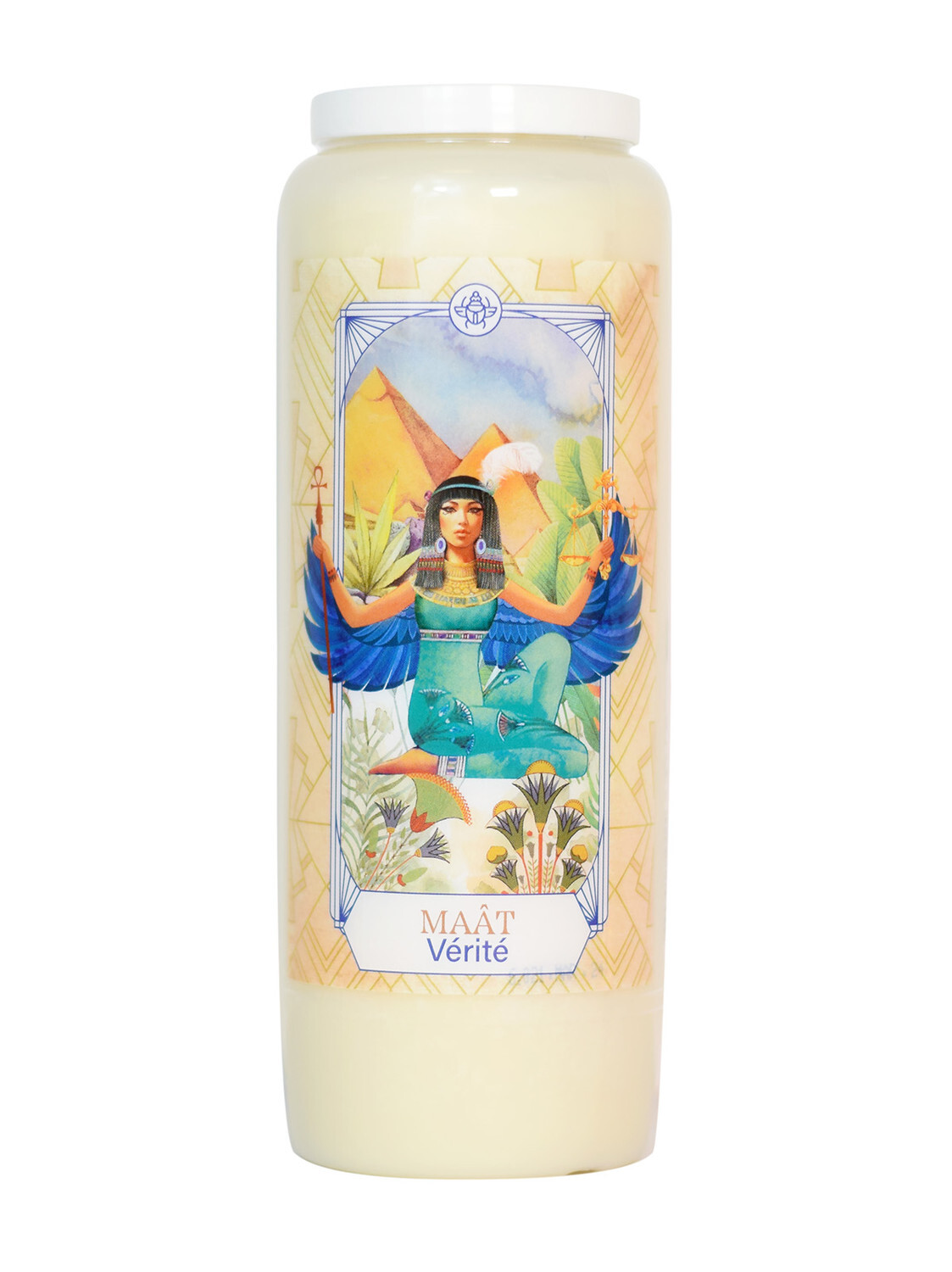 Neuvaine des Déesses du Monde Maat [DESCRIPTION] Découvrez le mythe de MAÂT, déesse majeure du panthéon égyptien. Allégorie de la Justice Divine, personnification de l'Ordre Cosmique, Maât, dont le nom signifie littéralement « droiture », est la fille du dieu tout puissant Rê dont elle protège la création des forces du chaos. Liée à l'élément air, sa plume blanche de la vertu est l'unité de mesure lors de la pesée de l'âme, garantissant la légèreté d'un cœur sans péché. Le pouvoir de Maât est illimité, même les Dieux ne peuvent se soustraire à son jugement implacable face aux conduites amorales. Elle décide des châtiments et des récompenses, de qui mérite la vie éternelle. Emblème de la vérité absolue, elle incarne la rectitude, l'ordre universel, les lois humaines et célestes, l'honnêteté, l'éthique et l'équité. Dans l’Égypte antique, les pharaons demandaient à Maât de faire appliquer les rites traditionnels, respecter les valeurs et les bonnes mœurs. Elle était également la patronne des scribes, des juges et des magistrats. Elle sera utile aux personnes ayant besoin d'aide pour se positionner ou trancher une situation, de ramener de l'ordre dans leur vie, de faire entendre leur vérité et respecter leurs règles. Entrez dans le monde de Maât, recevez l'énergie de celle qui rétablit l'ordre et la paix en vous reconnectant au Féminin Sacré de La Justicière. [CARACTÉRISTIQUES] Bougie en cire 100g végétale. Copyright DG Diffusion – Catherine Sorolla Menassieu. [PACKAGING] Pot et couvercle plastique et étiquette adhésive.