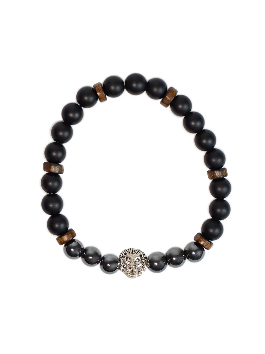 Bracelet perles rondes charms Tête de lion Hématite Obsidienne noire matte