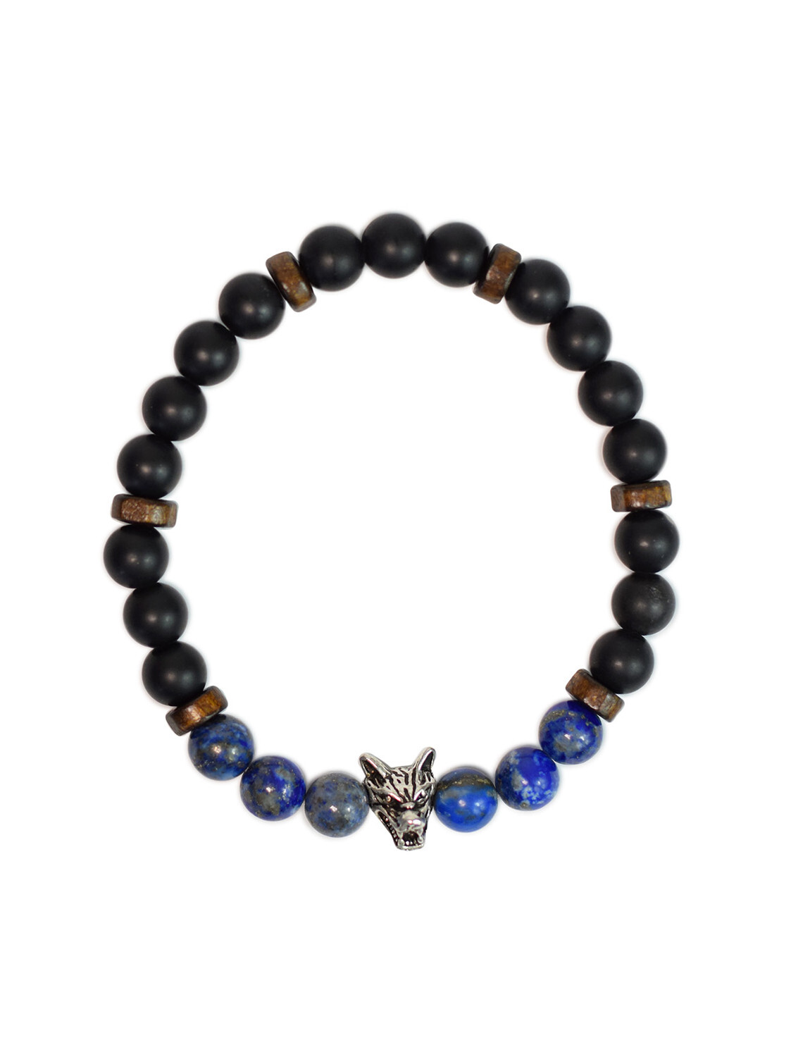 Bracelet perles rondes charms Tête de loup Lapis-lazuli Obsidienne noire matte