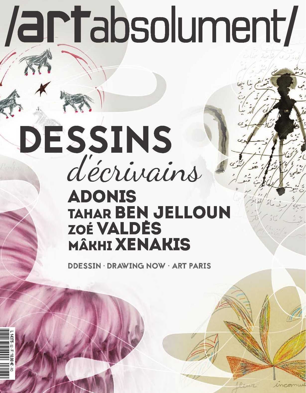 Dossier Dessin, des lignes et des mots Adonis Poète de peinture Zoé Valdés Du tokonoma imaginaire à l'écriture au pinceau Tahar Ben Jelloun Écrire la douleur du monde, peindre sa lumière Mâkhi Xenakis L'écriture de soi D Dessin Un autre paysage graphique Atelier Richelieu, Paris Nicolas Daubanes La condition humaine Palais de Tokyo, Paris Drawing Now Très large dessin contemporain Carreau du Temple, Paris Mondes graphiques Wols / Alexandre Léger Collection Prat Une histoire du dessin français Petit Palais, Paris