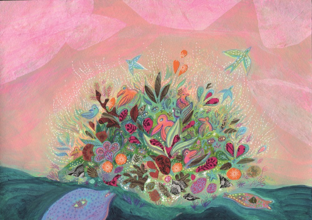 Gabrielle Wiehe artiste mauricienne, évocation de la création luxuriante des pays tropicaux. Couleurs, joie graphisme onirique propre à donner l'envie d'écrire et de partager une émotion positive. Cette illustratrice est une véritable artiste avec un style unique . Certaines de ses oeuvres sont encadrées pour de la déco.