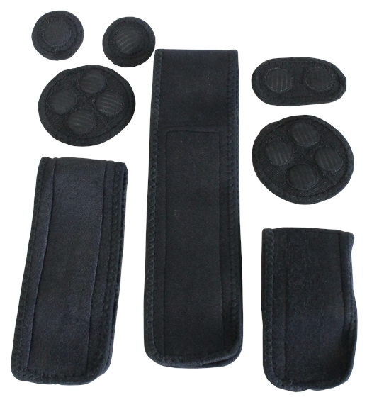 La pochette Kit d'Aimantothérapie. 3 bandes Velcros/Néoprène (60 cm x 7,5 cm - 38 cm x 8 cm - 24 cm x 7,5 cm) et 5 Aimants. 2 x 2 aimants (diamètre de 5 cm) - 2 x 4 aimants (diamètre de 9 cm) - 2 aimants (9 cm x 5,5 cm)