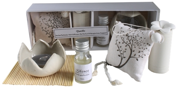 Pack diffuseur odorant contenant un sachet senteur pour votre armoire, voiture, tiroir, … un mini diffuseur avec bâtonnet, un flacon d'huiles essentielles de 10ml, une bougie ainsi que son porte bougie en forme de fleur. Vendu par lot de 2 bouquets : l'un senteur "Vanille", l'autre senteur "Silence".