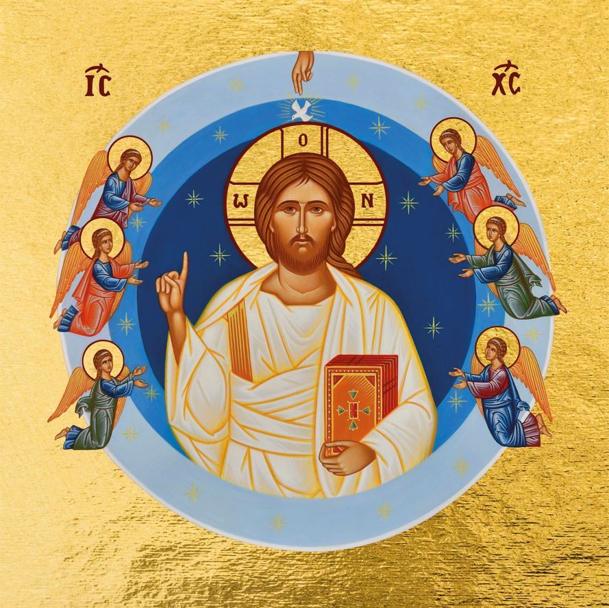 Entouré des anges en Adoration, le Christ nous enseigne par le Livre, par sa Présence et par le geste de sa main qui nous conduit vers le Père. Le Christ rayonne sur les cercles bleus qui représentent le cosmos, la création. L’Esprit Saint remplit l’univers, béni par les mains du Père. Les étoiles dorées dans le fond bleu nuit symbolisent la méditation chrétienne qui, dès l’aube, cherche Dieu. Conçue dans une collaboration entre l’atelier les Clémences et la peintre, cette icône, dans un art sublime, a été « écrite » par une iconographe contemporaine : madame Elisabeth Patier-Théréau.