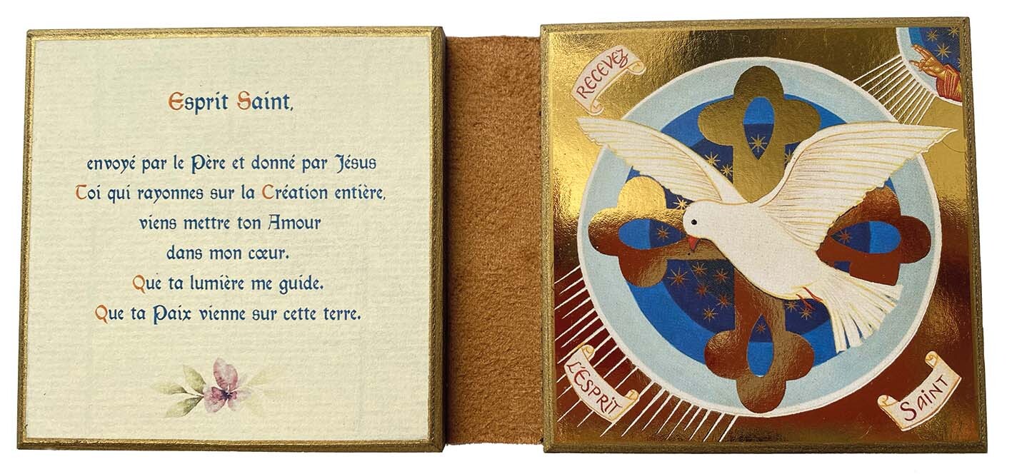 La Colombe qui annonce la Paix au monde. La Colombe messagère de l’Amour de Dieu. La Colombe qui nous unit au Père et au Fils. Cette icône merveilleuse représente le Saint Esprit. C’est la main du Père qui l’envoie (en haut à droite). C’est par la croix du Christ qu’il nous est donné. Le cosmos tout entier, représenté par les cercles bleus et les étoiles, rayonne de cette lumière que l’Esprit Saint vient répandre jusque dans nos cœurs. Réalisée par l’iconographe contemporaine « Didi » sur une conception de l’atelier les clémences