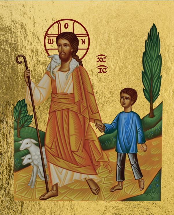 Quel enfant n’éprouvera-t-il pas du bonheur en se laissant conduire par la main de Jésus sur le chemin de sa vie ? Jésus ouvre le chemin, son pas est ferme, il regarde vers l’avenir et entraîne le petit garçon à sa suite. Voici l’icône par excellence de la confiance en Dieu. Très symbolique, cette icône aux couleurs sublimes, nous dit en image combien Dieu est proche de chacun de ses enfants. Réalisée par notre iconographe Élisabeth Patier Théreau, avec le talent qu’on lui connaît. Sur une conception Atelier Les Clémences.
