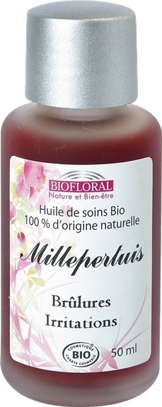 Les huiles de soins sont issues par première pression à froid de graines, de noix ou macérât huileux de fleurs provenant de l’agriculture biologique pour préserver le maximum de leurs bienfaits. Chaque huile a ses propres caractéristiques : adoucissantes, nourrissantes, revitalisantes pour répondre aux différents besoins de votre peau. Elles sont riches en vitamines pour protéger la peau des agressions extérieures, prévenir ou lutter contre son vieillissement et son dessèchement. Elles sont également un support idéal à nos huiles essentielles pour l’application cutanée. Huile au Millepertuis - Les tanins qui composent le millepertuis ont des propriétés cicatrisantes et astringentes. De fait, l’huile au millepertuis est appréciée depuis l’Antiquité pour ses vertus apaisantes contre les « coups de soleil » et les brûlures légères. Adoucissante et nourrissante, elle est également recommandée pour calmer irritations et rougeurs des peaux sèches. Idéale aussi pour un massage décontractant. Attention : ne pas s’exposer au soleil pendant ou après application.