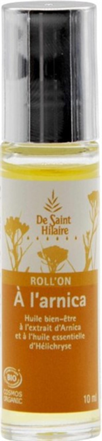 - Roll-on De Saint Hilaire aux huiles essentielles Arnica BIO 10 ml [DESCRIPTION] Ce Roll-on De Saint Hilaire est composé de macérat d'Arnica et d'huile essentielle d'Helichryse. Grâce à sa bille et son format très faciles d'emploi, ce roll'on est idéal à transporter pour garder toujours sur soi. [CONSEILS D'UTILISATION] Appliquer directement sur les zones affectées (chocs, bleus, bosses...). [PRÉCAUTIONS D'EMPLOI] Usage externe uniquement. Eviter tout contact avec les yeux et les muqueuses. Eviter d'utiliser sous exposition solaire. Déconseillé pour les enfants de moins de 6 ans et aux femmes enceintes. Ne pas avaler. Produit issu de l'agriculture biologique, COSMOS ORGANIC certifié par Ecocert Greenlife selon le référentiel COSMOS.