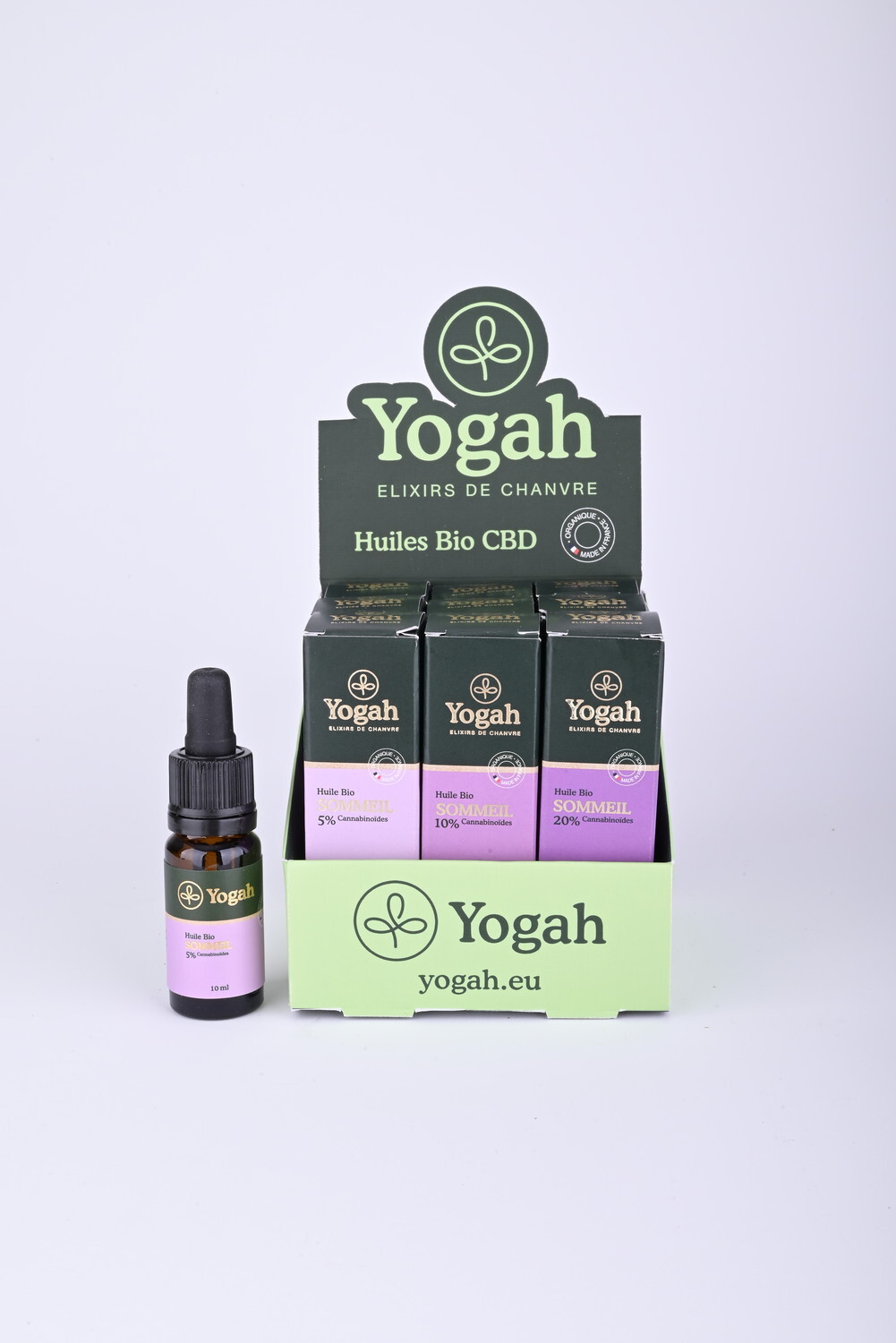 Présentoir de 9 huiles au CBD 10 ml Sommeil Yogah [DESCRIPTION] Présentoir composé de 9 huiles au CBD Sommeil Broad Spectrum. L’huile CBD Sommeil est un produit à base de 3 cannabinoïdes spécialement conçu pour favoriser l’endormissement et améliorer la qualité du sommeil. Véritable alliée détente, elle aide à retrouver un équilibre entre le corps et l’esprit au quotidien. Les huiles CBD Sommeil sont fabriquées à partir d’extrait de chanvre obtenu par la méthode du CO2 hyper-critique, de l’huile de tournesol bio du Gers et de l’arôme naturel de verveine bio. Ces huiles à spectre large contiennent 3 cannabinoïdes : CBN, CBD, CBG et sont déclinées en 3 concentrations : 5%, 10% et 20%. Elles ne contiennent pas de THC. [CARACTÉRISTIQUES] Contient : 3 huiles CBD 5%, 3 huiles CBD 10%, 3 huiles CBD 20%. Plus le dosage en CBD d’une huile est élevé et plus elle convient à des symptômes forts (anxiété intense, angoisse…). Composition : huile bio de tournesol, extrait naturel de chanvre français bio, arôme naturel de verveine bio. Fabriqué en France. [CONSEILS D'UTILISATION] Agiter avant emploi. Quelques gouttes sous la langue, 1h avant le coucher. Laisser agir 1 minute avant d'avaler. [PACKAGING] Boîtes carton pliantes et présentoir carton. [PRÉCAUTIONS D'EMPLOI] Déconseillé aux femmes enceintes ou allaitantes et aux enfants.