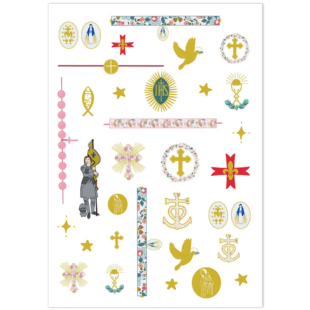 La coquetterie n’est pas toujours un vilain défaut! Ces tatouages éphémères, très girly ou discrets, fleuris ou aspect or, plairont aux petites filles qui veulent penser à Jésus et se souvenir qu’Il les aime. Taille de la planche: 21X14,8cm Emballage: Film plastique refermable MODE D’EMPLOI 1- La peau doit être propre et sèche. 2- Choisir un motif, le découper. Puis retirer le film transparent. 3- Appliquer la face du motif fermement sur la peau. 4- Presser un linge mouillé ou une éponge sur le tatouage pour l’humidifier uniformément. 5- Patienter sagement pendant 20 secondes environ. 6- Retirer doucement le papier et laisser sécher le tatouage. Celui-ci restera quelques jours sur la peau et pourra être enlevé avec du savon ou du lait de toilette. RECOMMANDATIONS Ces tatouages ne s’utilisent pas sur des peaux sensibles et ne se posent jamais à proximité des yeux. Ne pas appliquer sur un enfant de moins de 3 ans. Fabriqué avec des encres non-toxiques et hypoallergéniques.