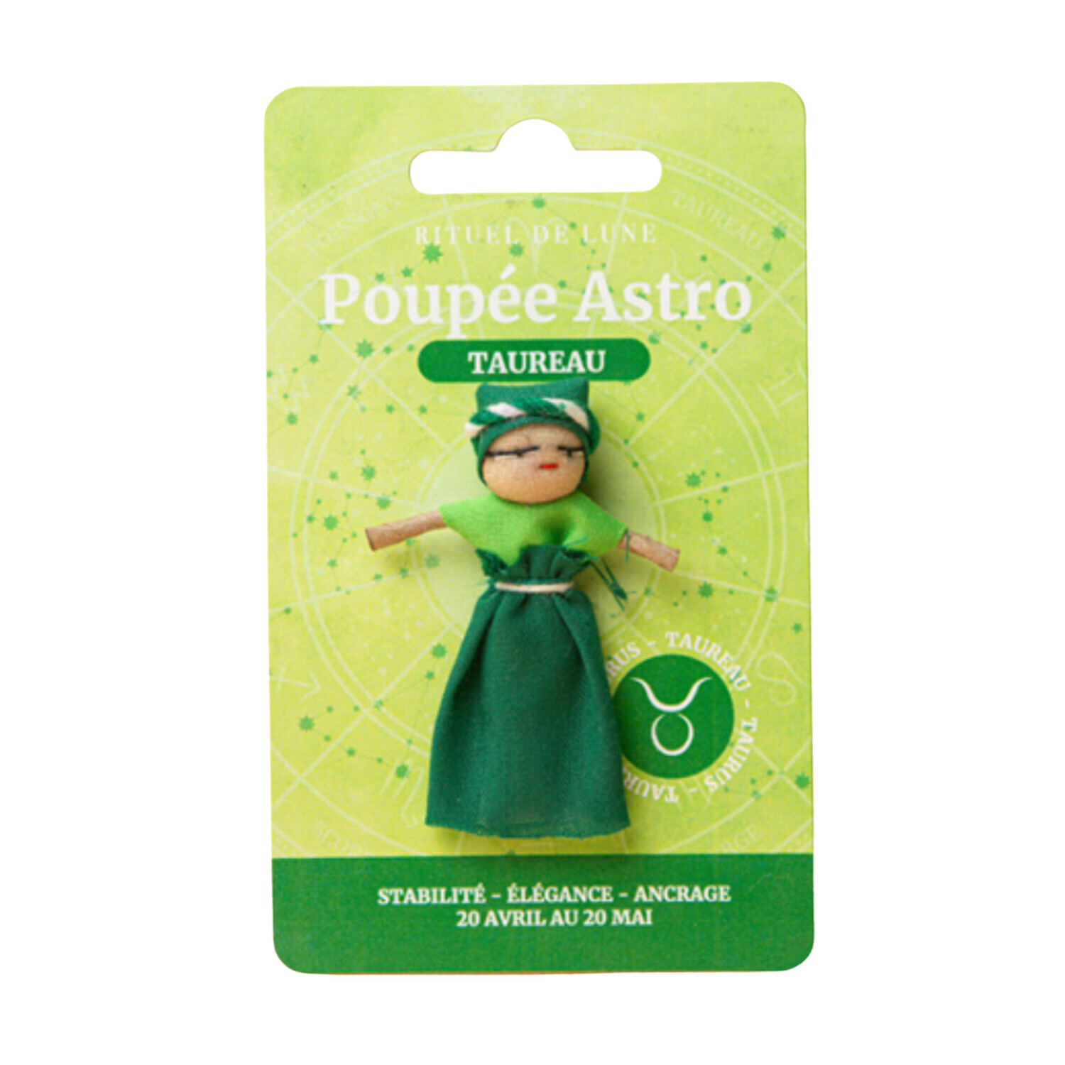 Poupée à soucis Astro Taureau [DESCRIPTION] Le Taureau est un signe de Terre ancré, puisant sa force dans sa stabilité. Doté d'un goût prononcé pour le confort et la beauté, ce natif apporte une touche d'élégance à son existence et cultive des relations solides et durables. Inspirée de la légende des poupées à soucis du Guatemala, la poupée astro Taureau vous aidera à vous connecter à votre signe et à révéler tout son potentiel. Gardez la toujours près de vous et laissez la magie opérer. [CARACTÉRISTIQUES] Fabriquée à la main au Guatemala. [PACKAGING] Carte imprimée brochable.