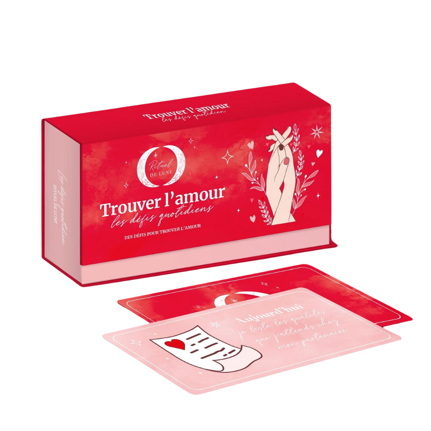 Jeux de cartes Les Défis quotidiens - Trouver l'Amour - Rituel de Lune [DESCRIPTION] Sortez de votre zone de confort et trouver l'amour grâce à ce jeu de 54 cartes qui vous accompagnent au quotidien pour vous challenger et vous sortir de votre zone de confort... Tous les jours...Tirez une carte au hasard, relevez le défi et trouvez l'amour... [CARACTÉRISTIQUES] 54 cartes aux bords arrondis pelliculage mat recto/verso avec un touché doux effet peau de pêche pour une qualité de manipulation optimale. Dimension de la boîte : 13 x 7 cm. [CONSEILS D'UTILISATION] Tous les jours, tirer une carte, relever le défi et booster sa confiance en soi. [PACKAGING] Boite rigide aimantée pour ranger les cartes facilement et les emmener partout avec soi.
