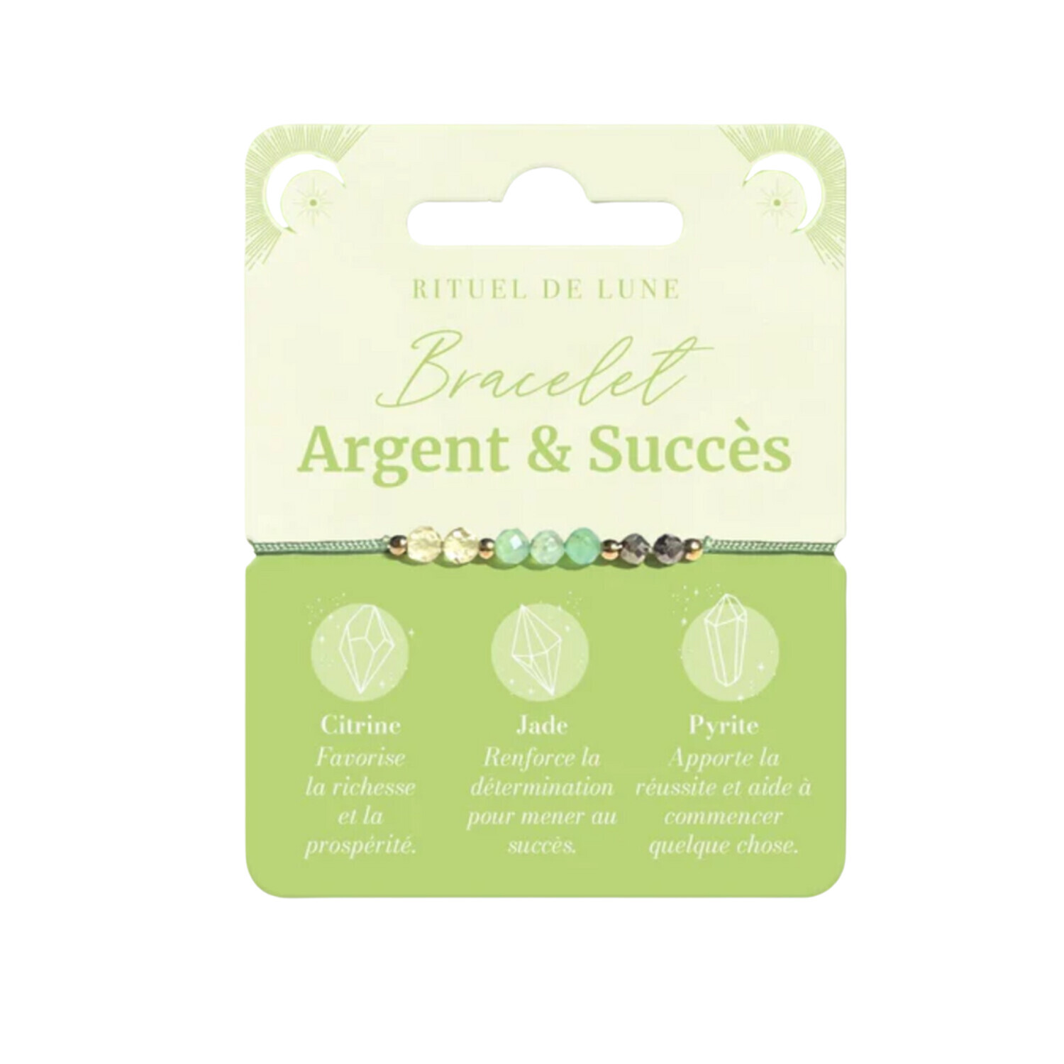 Bracelet en pierres naturelles Argent et succès [DESCRIPTION] Ce bracelet "Argent et Succès" Rituel de Lune en pierres naturelles est composé de perles de citrine, de jade et de pyrite. La synergie de ces 3 pierres favorise l’abondance et le succès. portez ce bracelet sur vous, répétez ce mantra « l’abondance arrive facilement à moi » et profitez de ses vertus... Citrine: Favorise la richesse et la prospe´rite´. Jade: Renforce la de´termination pour mener au succe`s. Pyrite: Apporte la re´ussite et aide a` commencer quelque chose. [CARACTÉRISTIQUES] Perles naturelles facettées de 3mm avec perles en acier inoxydable sur cordon réglable. [PACKAGING] Carte brochable imprimée.