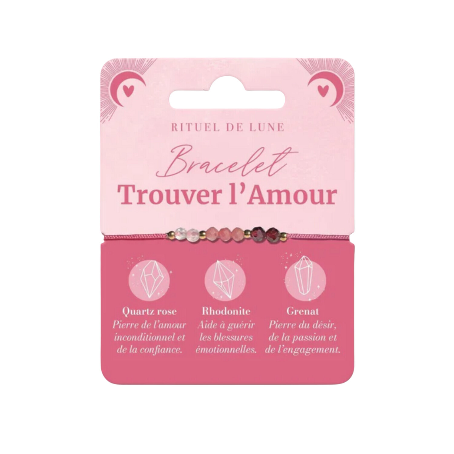 Bracelet en pierres naturelles Trouver l'Amour [DESCRIPTION] Ce bracelet "Trouver l'Amour" Rituel de Lune en pierres naturelles est composé de perles de quartz rose, de rhodonite et de grenat. La synergie de ces 3 pierres aide à trouver le véritable amour. Portez ce bracelet sur vous, répétez ce mantra « je suis prête pour mon âme-sœur » et profitez de ses vertus... Quartz rose: Pierre de l’amour inconditionnel et de la confiance. Rhodonite: Aide a` gue´rir les blessures e´motionnelles. Grenat: Pierre du de´sir, de la passion et de l’engagement. [CARACTÉRISTIQUES] Perles naturelles facettées de 3mm avec perles en acier inoxydable sur cordon réglable. [PACKAGING] Carte brochable imprimée.