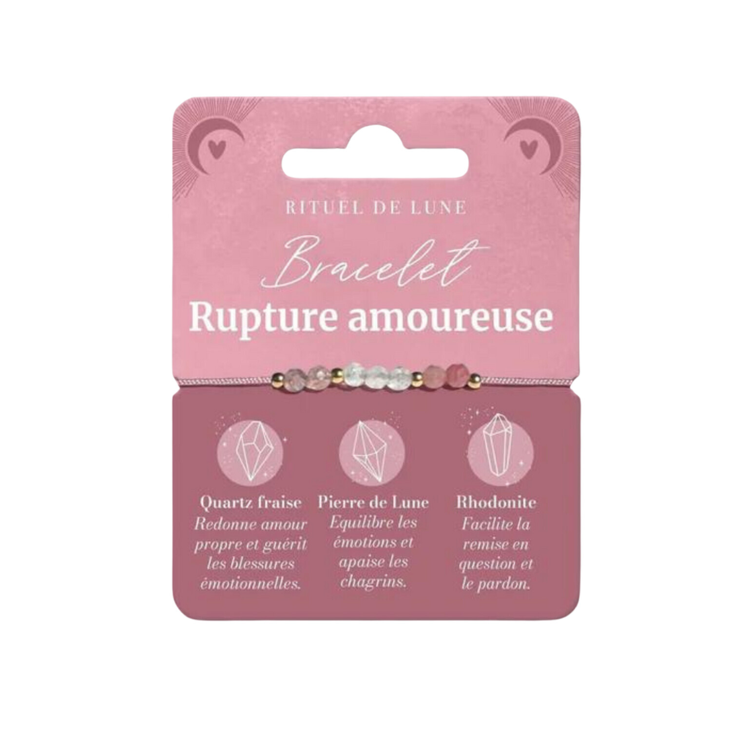 Bracelet en pierres naturelles Rupture Amoureuse [DESCRIPTION] Ce bracelet "Rupture Amoureuse" Rituel de Lune, en pierres naturelles est composé de perles de quartz fraise, de rhodonite et de pierre de lune. Lors d’une rupture amoureuse, la synergie de ces 3 pierres aide à soigner son cœur. Portez ce bracelet sur vous, répétez ce mantra « je vais de l’avant » et profitez de ses vertus... Quartz fraise: Redonne amour propre et gue´rit les blessures e´motionnelles. Pierre de Lune: Equilibre les e´motions et apaise les chagrins. Rhodonite: Facilite la remise en question et le pardon. [CARACTÉRISTIQUES] Perles naturelles facettées de 3mm avec perles en acier inoxydable sur cordon réglable. [PACKAGING] Carte brochable imprimée.