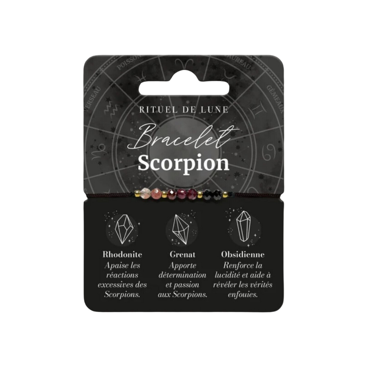 Bracelet Astrologie en pierres naturelles Scorpion [DESCRIPTION] Le scorpion est un signe d’eau passionné et intense. Il peut être mystérieux mais sa loyauté est inébranlable. Ce bracelet Astro, Rituel de Lune en pierres naturelles est composé de rhodonite, de grenat et d’obsidienne noire. La synergie de ces trois pierres accompagne le natif de ce signe en lui apportant apaisement, détermination, passion et lucidité. Rhodonite : apaise les re´actions excessives des Scorpions. Grenat : apporte détermination et passion aux Scorpions. Obsidienne : renforce la lucidite´ et aide a` re´ve´ler les ve´rite´s enfouies. [CARACTÉRISTIQUES] Perles naturelles facettées de 3mm avec perles en acier inoxydable sur cordon réglable. [PACKAGING] Cartonette imprimée brochable.