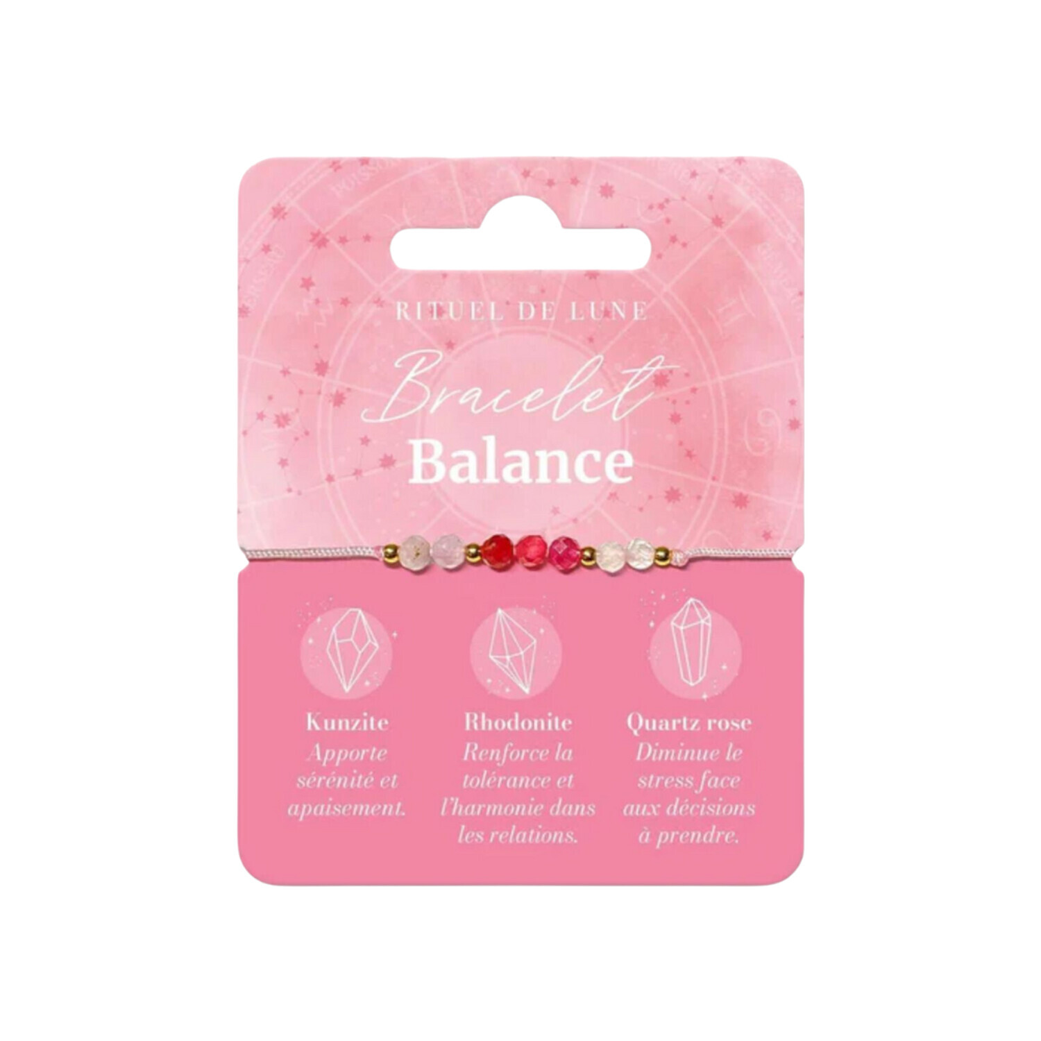 Bracelet Astrologie en pierres naturelles Balance [DESCRIPTION] La balance est un signe d’air qui se distingue par sa quête constante d'équilibre et d'harmonie. Ce bracelet en pierres naturelles Rituel de Lune est composé de kunzite, de rhodonite et de quartz rose. La synergie de ces trois pierres accompagne le natif de ce signe en lui apportant apaisement, harmonie et équilibre. Kunzite : apporte se´re´nite´ et apaisement. Rhodonite : renforce la tolérance et l'harmonie dans les relations. Quartz rose : diminue le stress face aux décisions à prendre. [CARACTÉRISTIQUES] Perles naturelles facettées de 3mm avec perles en acier inoxydable sur cordon réglable. [PACKAGING] Cartonette imprimée brochable.