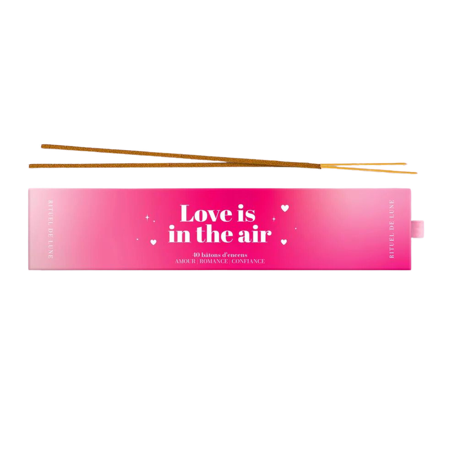 Encens Love is in the air Rituel de Lune [DESCRIPTION] Prenez confiance en vous et trouvez l'amour ! Chaque bâton d'encens a été méticuleusement fabriqué avec des ingrédients de qualité suivant une méthode ancestrale indienne pour favoriser des énergies d'amour, de confiance et aphrodisiaques... Le rituel : allumez un bâton d'encens, puis lorsque la flamme est encore présente, soufflez délicatement sur elle en pensant très fort à l'amour que vous souhaitez dans votre vie puis laissez la magie opérer... [CARACTÉRISTIQUES] Boîte rigide : 40 bâtons d'encens fabriqués en Inde aux ingrédients naturels parfumés à la rose et au bois de santal. [PACKAGING] Boîte carton imprimée rigide.