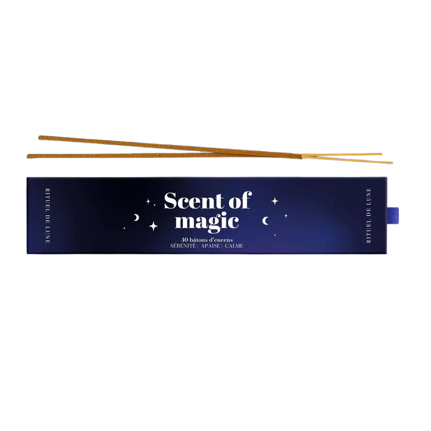 Encens Scent of magic Rituel de Lune [DESCRIPTION] Trouvez le calme et faites place à la sérénité ! Chaque bâton d'encens a été méticuleusement fabriqué avec des ingrédients de qualité suivant une méthode ancestrale indienne pour favoriser une ambiance propice à la détente et au lâcher prise. Le rituel : allumez un bâton d'encens, puis lorsque la flamme est encore présente, soufflez délicatement sur elle en faisant le calme dans votre esprit puis laissez la magie opérer... [CARACTÉRISTIQUES] Boîte Rigide : 40 encens fabriqués en Inde aux ingrédients naturels parfumés à la lavande, à la rose et au cèdre. [PACKAGING] Boîte carton imprimée rigide.