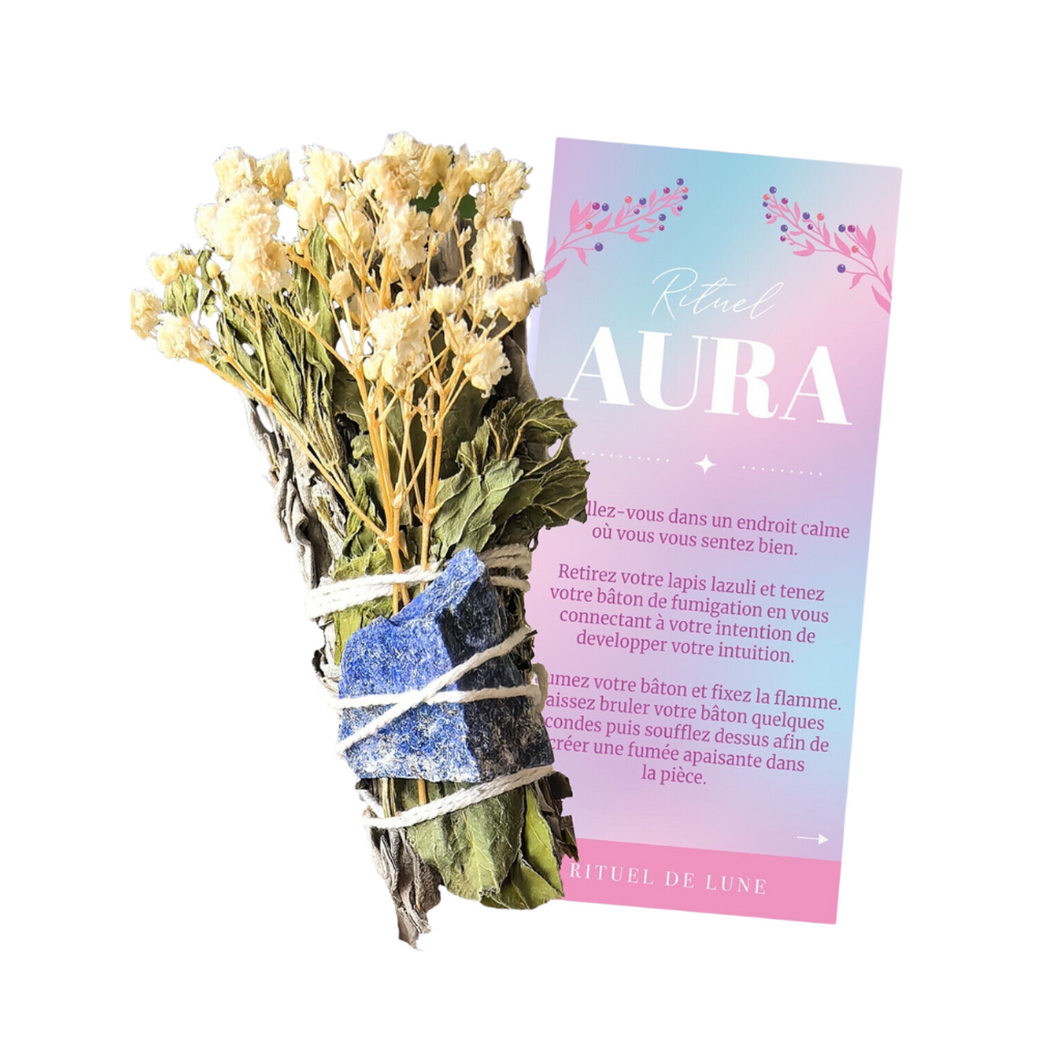 Rituel de fumigation Aura [DESCRIPTION] Ce rituel a été conçu pour éclaircir l’esprit et renforcer votre intuition. Chaque volute de fumée agit comme un guide, dissipant les énergies stagnantes pour laisser place à une clarté intérieure propice à la méditation. En harmonisant vos perceptions, ce kit vous aide à mieux écouter votre intuition et à affirmer vos intentions avec justesse. [CARACTÉRISTIQUES] Kit de fumigation composé de : sauge, menthe, gypsophile et d'une pierre naturelle de lapis lazuli. [CONSEILS D'UTILISATION] Installez-vous dans un endroit calme où vous vous sentez bien.Retirez votre lapis lazuli et tenez votre bâton de fumigation en vous connectant à votre intention de développer votre intuition.Allumez votre bâton et fixer la flamme.Laissez bruler votre bâton quelques secondes puis soufflez dessus afin de créer une fumée apaisante dans la pièce. [PRÉCAUTIONS D'EMPLOI] Utiliser sur une surface thermorésistante. Ventiler la pièce après utilisation. Bien se laver les mains après manipulation. En cas d'irritation cutanée, laver au savon et à l'eau. En cas de contact avec les yeux, rincer abondamment à l'eau pendant 15 minutes. Si l'irritation persiste, consulter votre médecin.