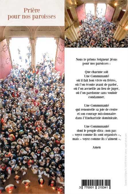 Nous te prions Seigneur Jésus pour nos paroisses : Que chacun soit Une communauté où il fait bon vivre en frères, où l'on écoute avant de parler, où l'on accueille au lieu de juger, où l'on pardonne sans vouloir condamner. Une communauté qui renouvelle sa joie de croire et son courage missionnaire dans l'Eucharistie dominicale. Une communauté dont le peuple dira : non pas voyez comme ils sont organisés. mais voyez comme ils s'aiment. Amen