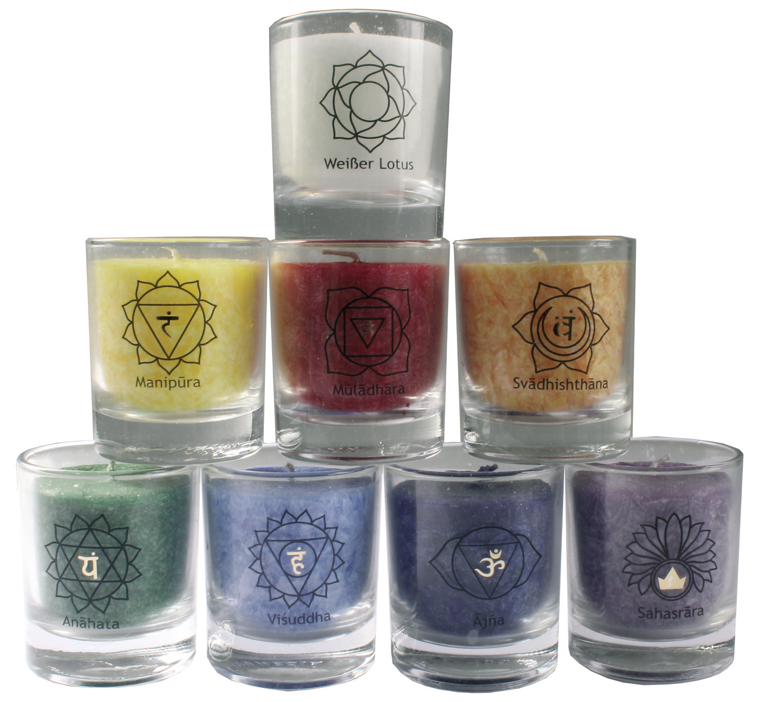 Ensemble de 8 petites bougies. Chaque bougie de couleur est estampillé du symbole du chakra et nom correspondant. La 8ème bougie est une bougie blanche ''lotus''. Composition huile de palme.
