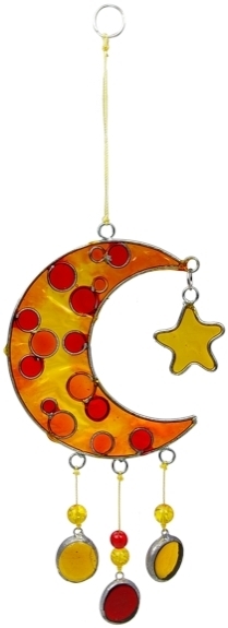 Attrape soleil en forme de croissant de lune rousse tâchetée de points rouges, y sont suspendus une étoile et trois boules avec des perles. Dimension : 25 cm de haut. Le tout suspendu par un fil et un anneau. Le manque de soleil peut influencer fortement notre humeur. Attachez un attrape soleil devant votre vitre afin de profiter des doux rayons du soleil. Vous apprécierez les reflets qu'ils projetteront dans votre foyer, autant de couleur et de gaieté pour vos journées. La manière dont le verre a été coulé lors de la création de l'attrape soleil lui permet de refléter la lumière dans toutes les directions. Les aspérités crées intentionnellement lui permettent d'être actif à la fois sur votre caractère et sur votre santé.