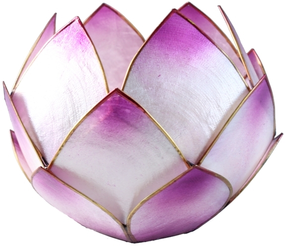 Bougeoir pour le crépuscule en forme de lotus pour bougies de type chauffe-plat. Disponible en plusieurs coloris. Déposez une bougie au cœur du lotus, et ajoutez une touche florale et colorée à vos tables. Les bougeoirs sont composés de 3 rangées de pétales qui se renferment sur elles-mêmes et garantissent un bel effet de volume. Leur aspect semi-métallique donnera de jolis jeux de lumières avec la flamme des bougies. Ce type de photophore est idéal aussi pour méditer sur un chakra précis grâce à sa couleur (chromothérapie). Les pétales sont en nacre et sertis d'étain. Le nettoyage se fait avec un linge légèrement humide. Diamètre environ 14 cm. Conditionnement en boite individuelle en carton. Vendu sans bougies.
