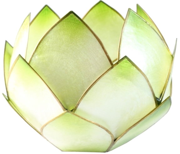 Bougeoir pour le crépuscule en forme de lotus pour bougies de type chauffe-plat. Disponible en plusieurs coloris. Déposez une bougie au cœur du lotus, et ajoutez une touche florale et colorée à vos tables. Les bougeoirs sont composés de 3 rangées de pétales qui se renferment sur elles-mêmes et garantissent un bel effet de volume. Leur aspect semi-métallique donnera de jolis jeux de lumières avec la flamme des bougies. Ce type de photophore est idéal aussi pour méditer sur un chakra précis grâce à sa couleur (chromothérapie). Les pétales sont en nacre et sertis d'étain. Le nettoyage se fait avec un linge légèrement humide. Diamètre environ 14 cm. Conditionnement en boite individuelle en carton. Vendu sans bougies.