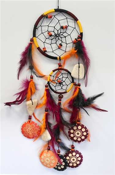 Hauteur totale : 49 cm - Diametre du cercle principal : 12 cm. D'après la mythologie indienne, l'attrapeur de rêve ne laisse passer que les rêves heureux tandis qu'il attrape tous les mauvais rêves dans le filet. Fabriqué à la main et orné de perles et de plumes, l'attrapeur de rêve est une parure décorative exceptionnelle.