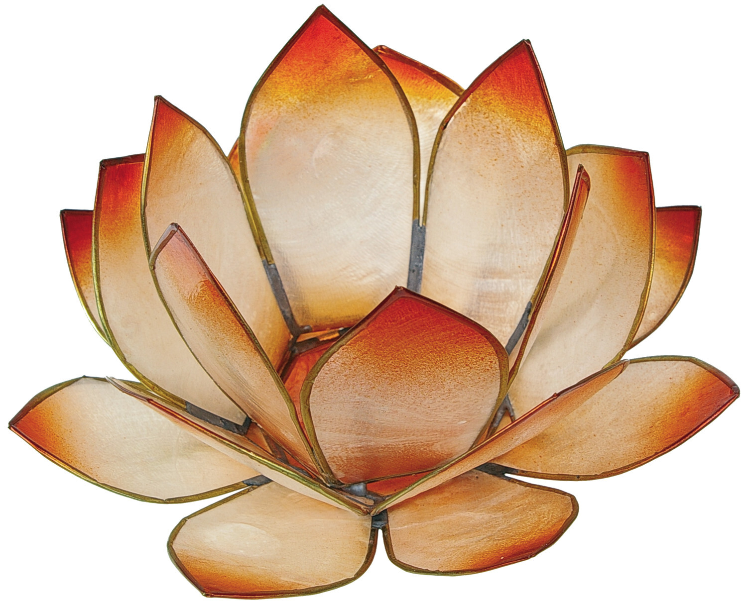Bougeoir en forme de lotus pour bougies de type ''chauffe-plat''. Disponible en plusieurs coloris. Déposez une bougie au cœur du lotus, et ajoutez une touche florale et colorée à vos tables. Les bougeoirs sont composés de 3 rangées de pétales et garantissent un bel effet de volume. Leur aspect semi-métallique donnera de jolis jeux de lumières avec la flamme des bougies. Ce type de photophore est idéal aussi pour méditer sur un chakra précis grâce à sa couleur (chromothérapie). Les pétales sont en nacre et sertis d'étain. Le nettoyage se fait avec un linge légèrement humide. Diamètre environ 14 cm. Conditionnement en boite carton individuelle. Vendu sans bougies.