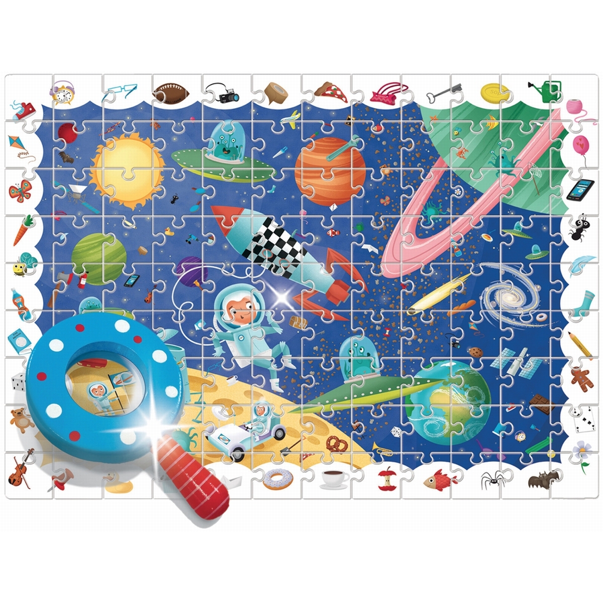 A partir de 3 ans Trouve les détails avec la loupe ! Description : Grande planche finement illustrée dans un univers « spatial » magique. Après avoir recomposé le puzzle, avec la loupe en bois fournie, les enfants s?amuseront à découvrir les 40 éléments indiqués dans le cadre du puzzle et cachés dans l?illustration. Contenu du jeu : Maxi puzzle 70 x 50 cm, 108 grandes pièces de grosse épaisseur, grosse loupe en bois. - Minimum de commande pour cet article : 3 unités - Minimum de commande Wilson Jeux : 100€ - CGV : http://wilsonjeux.fr/pdf/CGV-dilicom.pdf