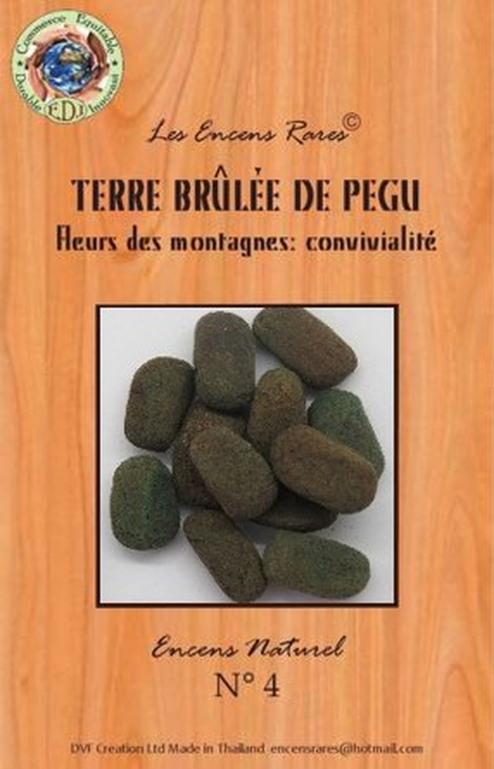 Les Encens Rares sont fabriqués artisanalement par DVF (une entreprise familiale franco-thaïlandaise), depuis 1999, dans un petit village de Thaïlande, à 350 km de Bangkok, au cœur des rizières, près de la frontière cambodgienne. Ces encens ont la particularité de se consumer naturellement sans charbon, ni bois. Le désagrément provoqué par la fumée s’en trouve ainsi réduit et le parfum est parfaitement restitué. La production est volontairement limitée afin de préserver et respecter les pratiques artisanales. Pour la fabrication DVF utillise des plantes, des fleurs, des herbes, des épices et des résines naturelles. L’amalgame s’effectue avec de l’eau de pluie et le séchage, à l’air libre au soleil. Le soin apporté à cette fabrication artisanale, depuis plus de 23 ans, permet de garantir un produit de grande qualité. [DESCRIPTION] Encens Rares Terre brûlée de Pegu - Fleurs des montagnes : Convivialité. [CARACTÉRISTIQUES] Sachet de 25 g. Fabrication 100% artisanale (ni machine, ni four) en Thaïlande. Composition : plantes, fleurs, paille de riz, feuilles d'eucalyptus, de bananier et benjoin. [CONSEILS D'UTILISATION] Allumer une extrémité avec un briquet ou une allumette. Eteindre la flamme après une vingtaine de secondes. Lorsque l'incandescence est homogène, souffler la flamme. [PACKAGING] Sachet plastique avec fourreau brochable [PRÉCAUTIONS D'EMPLOI] Ne pas laisser à portée des enfants. Eviter d'inhaler les volutes de fumée. Ventiler la pièce après l'utilisation.
