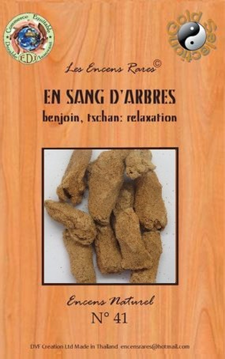 Les Encens Rares sont fabriqués artisanalement par DVF (une entreprise familiale franco-thaïlandaise), depuis 1999, dans un petit village de Thaïlande, à 350 km de Bangkok, au cœur des rizières, près de la frontière cambodgienne. Ces encens ont la particularité de se consumer naturellement sans charbon, ni bois. Le désagrément provoqué par la fumée s’en trouve ainsi réduit et le parfum est parfaitement restitué. La production est volontairement limitée afin de préserver et respecter les pratiques artisanales. Pour la fabrication DVF utillise des plantes, des fleurs, des herbes, des épices et des résines naturelles. L’amalgame s’effectue avec de l’eau de pluie et le séchage, à l’air libre au soleil. Le soin apporté à cette fabrication artisanale, depuis plus de 23 ans, permet de garantir un produit de grande qualité. [DESCRIPTION] Encens Rares En sang d'arbres - Benjoin, tschan : Relaxation. [CARACTÉRISTIQUES] Sachet de 25 g. Fabrication 100% artisanale (ni machine, ni four) en Thaïlande. Composition : plantes, paille de riz, feuilles d'eucalyptus, de bananier, benjoin et tschan. [CONSEILS D'UTILISATION] Allumer une extrémité avec un briquet ou une allumette. Eteindre la flamme après une vingtaine de secondes. Lorsque l'incandescence est homogène, souffler la flamme. [PACKAGING] Sachet plastique avec fourreau brochable [PRÉCAUTIONS D'EMPLOI] Ne pas laisser à portée des enfants. Eviter d'inhaler les volutes de fumée. Ventiler la pièce après l'utilisation.