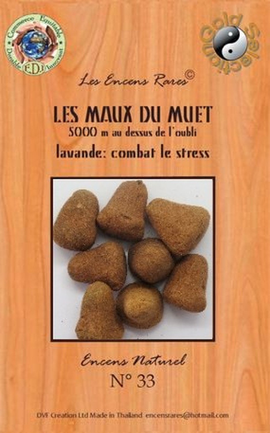 Les Encens Rares sont fabriqués artisanalement par DVF (une entreprise familiale franco-thaïlandaise), depuis 1999, dans un petit village de Thaïlande, à 350 km de Bangkok, au cœur des rizières, près de la frontière cambodgienne. Ces encens ont la particularité de se consumer naturellement sans charbon, ni bois. Le désagrément provoqué par la fumée s’en trouve ainsi réduit et le parfum est parfaitement restitué. La production est volontairement limitée afin de préserver et respecter les pratiques artisanales. Pour la fabrication DVF utillise des plantes, des fleurs, des herbes, des épices et des résines naturelles. L’amalgame s’effectue avec de l’eau de pluie et le séchage, à l’air libre au soleil. Le soin apporté à cette fabrication artisanale, depuis plus de 23 ans, permet de garantir un produit de grande qualité. [DESCRIPTION] Encens Rares Les maux du muet - 5000 mètres au-dessus de l'oubli - Lavande : Combat le stress. [CARACTÉRISTIQUES] Sachet de 25 g. Fabrication 100% artisanale (ni machine, ni four) en Thaïlande. Composition : plantes, paille de riz, feuilles d'eucalyptus, de bananier et benjoin. Fragrances lavande et santal. [CONSEILS D'UTILISATION] Allumer une extrémité avec un briquet ou une allumette. Eteindre la flamme après une vingtaine de secondes. Lorsque l'incandescence est homogène, souffler la flamme. [PACKAGING] Sachet plastique avec fourreau brochable [PRÉCAUTIONS D'EMPLOI] Ne pas laisser à portée des enfants. Eviter d'inhaler les volutes de fumée. Ventiler la pièce après l'utilisation.
