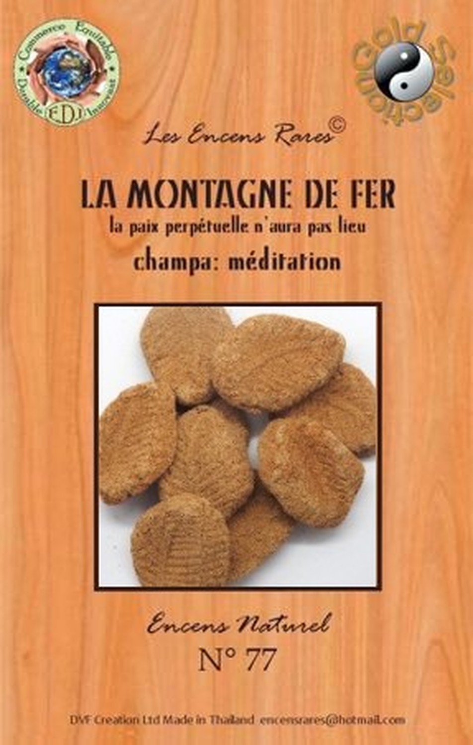 Les Encens Rares sont fabriqués artisanalement par DVF (une entreprise familiale franco-thaïlandaise), depuis 1999, dans un petit village de Thaïlande, à 350 km de Bangkok, au cœur des rizières, près de la frontière cambodgienne. Ces encens ont la particularité de se consumer naturellement sans charbon, ni bois. Le désagrément provoqué par la fumée s’en trouve ainsi réduit et le parfum est parfaitement restitué. La production est volontairement limitée afin de préserver et respecter les pratiques artisanales. Pour la fabrication DVF utillise des plantes, des fleurs, des herbes, des épices et des résines naturelles. L’amalgame s’effectue avec de l’eau de pluie et le séchage, à l’air libre au soleil. Le soin apporté à cette fabrication artisanale, depuis plus de 23 ans, permet de garantir un produit de grande qualité. [DESCRIPTION] Encens Rares La montagne de fer - La paix perpétuelle n'aura pas lieu - Champa : Méditation. [CARACTÉRISTIQUES] Sachet de 25 g. Fabrication 100% artisanale (ni machine, ni four) en Thaïlande. Composition : plantes, paille de riz, fleurs, écorces, feuilles d'eucalyptus, de bananier et benjoin. Fragrance champa. [CONSEILS D'UTILISATION] Allumer une extrémité avec un briquet ou une allumette. Eteindre la flamme après une vingtaine de secondes. Lorsque l'incandescence est homogène, souffler la flamme. [PACKAGING] Sachet plastique avec fourreau brochable [PRÉCAUTIONS D'EMPLOI] Ne pas laisser à portée des enfants. Eviter d'inhaler les volutes de fumée. Ventiler la pièce après l'utilisation.