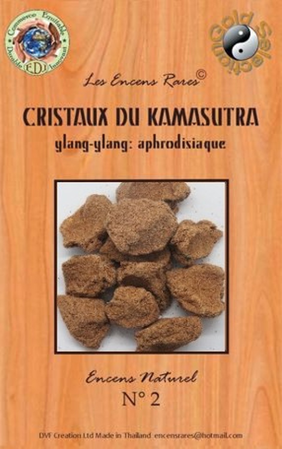 Les Encens Rares sont fabriqués artisanalement par DVF (une entreprise familiale franco-thaïlandaise), depuis 1999, dans un petit village de Thaïlande, à 350 km de Bangkok, au cœur des rizières, près de la frontière cambodgienne. Ces encens ont la particularité de se consumer naturellement sans charbon, ni bois. Le désagrément provoqué par la fumée s’en trouve ainsi réduit et le parfum est parfaitement restitué. La production est volontairement limitée afin de préserver et respecter les pratiques artisanales. Pour la fabrication DVF utillise des plantes, des fleurs, des herbes, des épices et des résines naturelles. L’amalgame s’effectue avec de l’eau de pluie et le séchage, à l’air libre au soleil. Le soin apporté à cette fabrication artisanale, depuis plus de 23 ans, permet de garantir un produit de grande qualité. [DESCRIPTION] Encens Rares Cristaux du Kamasutra - Ylang-ylang : Aphrodisiaque. [CARACTÉRISTIQUES] Sachet de 25 g. Fabrication 100% artisanale (ni machine, ni four) en Thaïlande. Composition : plantes, paille de riz, ginseng, feuilles d'eucalyptus, de bananier et benjoin. Fragrance Ylang-ylang. [CONSEILS D'UTILISATION] Allumer une extrémité avec un briquet ou une allumette. Eteindre la flamme après une vingtaine de secondes. Lorsque l'incandescence est homogène, souffler la flamme. [PACKAGING] Sachet plastique avec fourreau brochable [PRÉCAUTIONS D'EMPLOI] Ne pas laisser à portée des enfants. Eviter d'inhaler les volutes de fumée. Ventiler la pièce après l'utilisation.