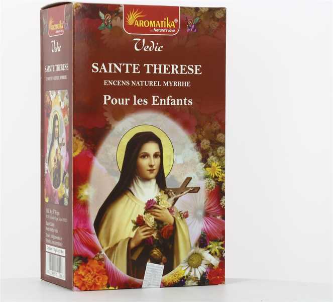 Encens Saint Thérèse de l'Enfant Jésus - Encens naturel de Myrrhe - pour les enfants Prière à Saint Thérèse : Sainte-Thérèse de l'Enfant Jésus, souvenez-vous de votre promesse de faire du bien sur la terre , répandez avec abondance votre pluie de roses sur ce qui vous invoque et obtenez-nous de Dieu les grâces que nous attendons de sa Bonté infinie AMEN. Boîte de 12 boîtes , soit 120 batonnets d'encens