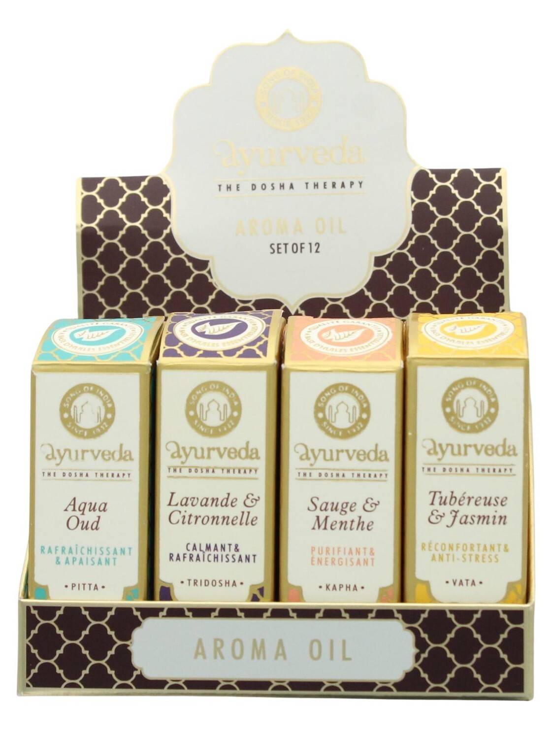 Présentoir pour huiles parfumées Ayurvéda 10 ml Song of India. [DESCRIPTION] Présentoir composé de 4 x 3 huiles parfumées pour diffusion à base d'huiles essentielles aux senteurs suivantes : aqua oud, tubéreuse et jasmin, sauge et menthe, lavande citronnelle. Song of India nous invite à découvrir la gamme d'huiles parfumées pour diffusion Ayurvéda adaptées à chaque dosha. Pitta, Vata, Kapha ou Tridosha, les huiles parfumées créent une ambiance merveilleuse qui nous ressemble. [CARACTÉRISTIQUES] Présentoir 4 x 3 huiles de 10 ml. Huiles parfumées à base d'huiles essentielles, huile de coco, huiles de graines de simmondsia. Bouteille en verre avec réducteur d'orifice. Contenance : 10 ml. Fabriqué en Inde. [CONSEILS D'UTILISATION] L'associer à une huile de base de son choix. Appliquer quelques gouttes sur le diffuseur ou sur le pot-pourri pour obtenir un parfum d'ambiance absolument merveilleux. réconfortant et anti-stress. [PACKAGING] Présentoir en carton imprimé. Boîtes carton pliantes imprimées individuelles. [PRÉCAUTIONS D'EMPLOI] Usage externe uniquement. Tenir à l'écart des enfants et des animaux. Ranger au frais et au sec, à l'abri du soleil. Nocif en cas d'ingestion. En cas d'ingestion : faire appel à un médecin en cas de malaise. Se rincer la bouche. Recueillir l'huile répandue. Risque de réaction allergique cutanée. En cas d'irritation de la peau : laver abondamment au savon et l'eau claire pendant plusieurs minutes. En cas de contact avec les yeux : rincer avec précaution à l'eau pendant plusieurs minutes. En cas d'irritation de la peau et d'éruption cutanée ou si l'irritation des yeux persiste, demander l'avis d'un médecin. Éliminer le contenu/le conditionnement conformément à la législation en vigueur.