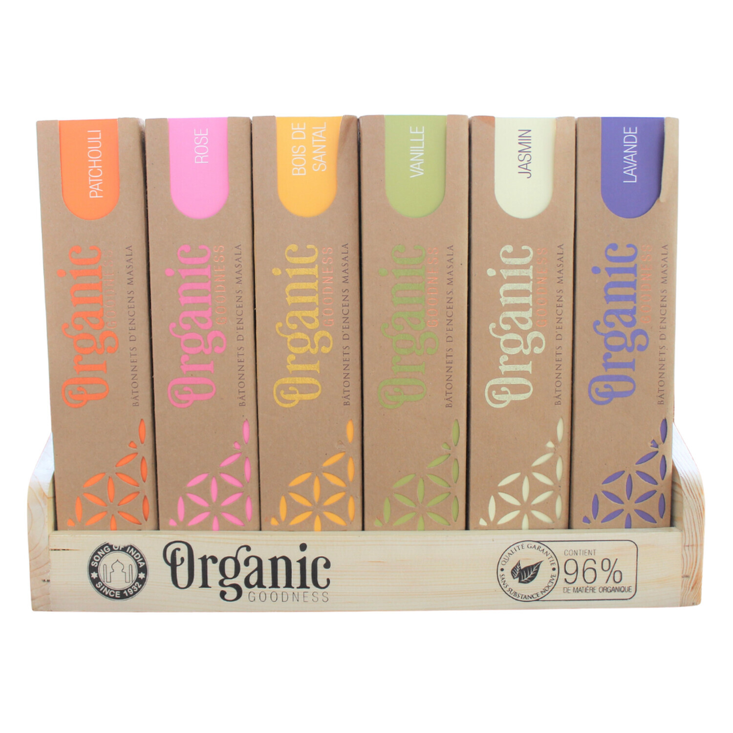 Présentoir en bois pour encens en bâton Organic 15 g Song of India. [DESCRIPTION] Présentoir composé de 6 x 12 encens en bâtonnets au senteurs suivantes : lavande, jasmin, bois de santal, rose, patchouli, vanille. Song of India nous invite à plonger dans la tradition indienne de l'encens au travers de sa gamme d'encens naturels ORGANIC. L'encens permet de se libérer l'esprit, augmente la conscience de soi pendant la méditation et crée une aura d'énergie positive. Ces bâtons d'encens masala, roulés à la main, ont été soigneusement préparés à partir de poudre de bois naturelle et d'extraits d'huiles essentielles. [CARACTÉRISTIQUES] Présentoir en bois de pin 6 x 12 encens bâton de 15 g. Composition : bâton de bambou, résine oliban naturelle, charbon actif, canne à sucre biologique, eau, poudre d'écorce d'encens, poudre de bois et huiles essentielles biologiques. Qualité garantie : écologique (96% d'ingrédients d'origine naturelle), non toxique, fait main en Inde, papier recyclé, sans sous-produits d'origine animale, sans main d'œuvre enfantine. [CONSEILS D'UTILISATION] Allumer l'extrémité de l'encens jusqu'à ce qu'elle s'enflamme. Lorsqu'elle est incandescente, souffler dessus délicatement pour éteindre la flamme. Placer le bâton d'encens sur son porte-encens. [PACKAGING] Présentoir en bois. Boîtes carton pliantes imprimées individuelles avec fenêtre. [PRÉCAUTIONS D'EMPLOI] Conserver hors de la portée des enfants. Ne jamais laisser brûler des bâtonnets d'encens sans surveillance. Ventiler pendant et après utilisation, éviter d'inhaler directement la fumée. Utiliser uniquement sur une surface thermos-résistante.
