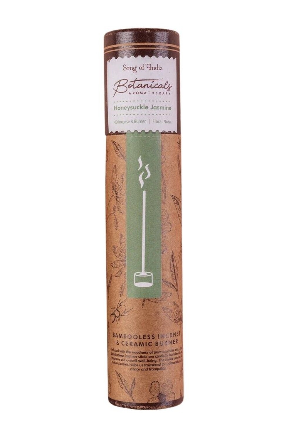 Encens Bâton Botanicals Chèvrefeuille Jasmin 15 g Song of India [DESCRIPTION] Encens de 40 bâtons avec un brule encens en céramique. Le divin arôme de ses notes fleuries de chèvrefeuille et de jasmin, nous emporte dans une ambiance relaxante. Infusés avec des huiles essentielles pures, ces encens sans bambou sont confectionnés à la main. [CARACTÉRISTIQUES] Encens 40 bâtonnets. Composition : poudre de bois de cèdre, poudre d'encens, gomme de guar, résine, parfum et huile essentielle. Porte-encens en céramique fourni. [CONSEILS D'UTILISATION] Allumer l'extrémité de l'encens jusqu'à ce qu'elle s'enflamme. Lorsqu'elle est incandescente, souffler dessus délicatement pour éteindre la flamme. Placer le bâton d'encens sur son porte-encens. [PACKAGING] Boîte cylindrique carton imprimée à cloche. [PRÉCAUTIONS D'EMPLOI] Conserver hors de la portée des enfants. Ne jamais laisser brûler des bâtonnets d'encens sans surveillance. Ventiler pendant et après utilisation, éviter d'inhaler directement la fumée. Utiliser uniquement sur une surface thermos-résistante.