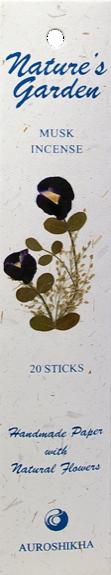Encens Auroshikha, collection « Nature's Garden ». Parfum Musc. Lot de 5 paquets contenant chacun 20 bâtonnets. Encens Indien de haute qualité conçu dans le plus grand respect de la tradition, des hommes et de l'environnement. Les fragrances de ces encens proviennent de différentes fleurs, de feuilles, d'écorces, de racines, d'herbes, d'épices, de résines naturelles ainsi que d'huiles essentielles pures. Chaque étui est réalisé en papier artisanal recyclé, puis est décoré individuellement à la main de fleurs naturelles. En choisissant cette gamme, vous soutenez la Udavi Gentillesse School, une école de la région d'Auroville en Inde du Sud.