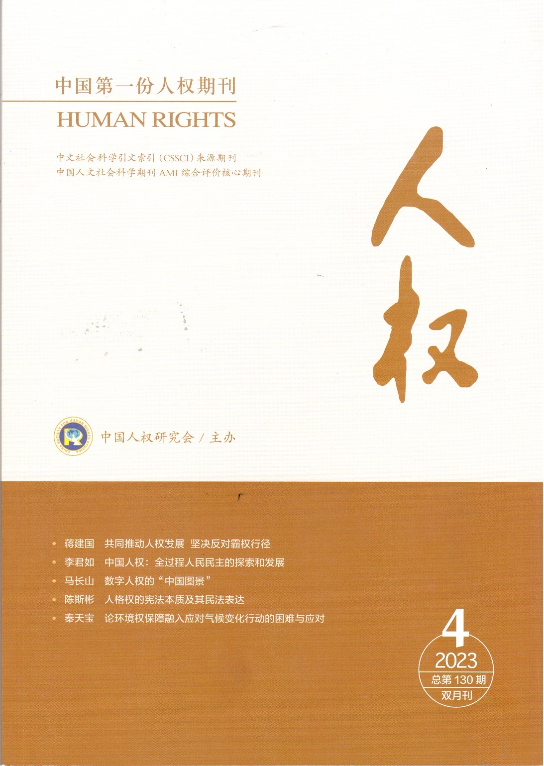 Journal du Human rights, depuis 2002, chaque numéro de journal est paru le 10 du mois impair , une parution tous les deux mois. contenu du NO °4 du 2023 (Serial No°130), 10 july, 2023 : Human rights in China: Exploration and development of whole-Process People's Democracy .....................Li Junru 1 Pratical logic and discourse interpretation of China's efforts to safeguard the right to subsistence ............... Wei Xiaoxu 12 Focus: Discussions on global human rights governance ...........................................................................................................34 Historical research on right in the Eyes of Young Marx ...................................................................................Yao Yuan 63 Constitutional Nature of personality rights and its manifestation in the civil law...............................................Chen Sibin 84 Right to family life: convergent interpretation between chinese mainland and Hongkong & Macao SARs .............Tu Kai 104 Human right in civil judicial documents: conception and function .....................................................................Zheng Ruohan 126 Challenges and countermeasures for intergrating the protection of environmental rights into actiuons for addressing climate change .Qin Tianbao&Yuan Yeyangguang 143 Eyes of the European Court of Human rights ......................................................................................................... He Wanyu 165 Building international consensus and working together to advance the development of the global human rights cause ----Summary of academic views at the Forum on Global human rights Governance ............................................................................................................................Sun Benxiong 184 Human rights information in China (2023.5-6) ..................................................................................................................................184